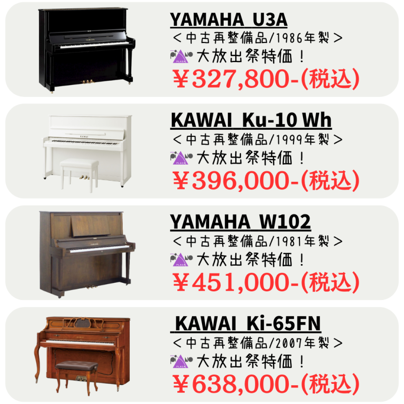 ※中古ピアノ、現品限りの新品ピアノなど掲載の品は、売り切れなどの理由により変更となる場合がございます。