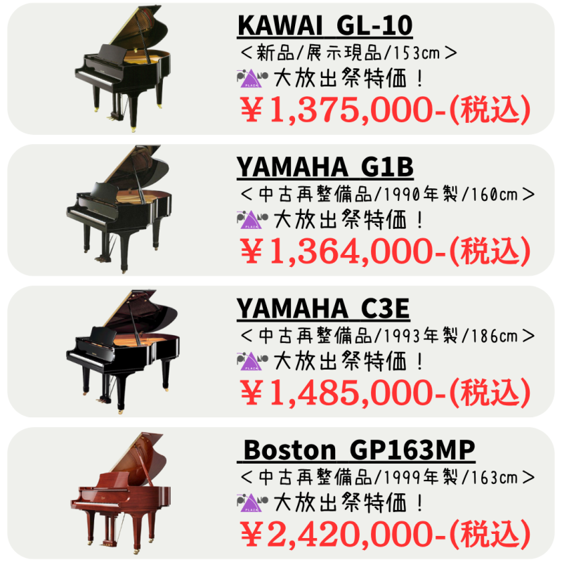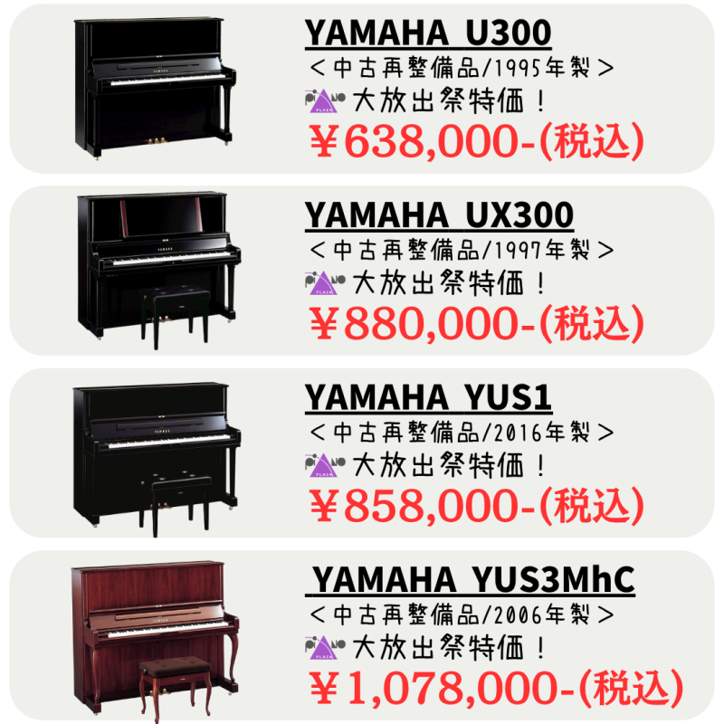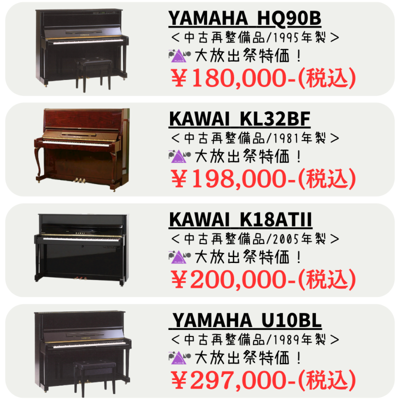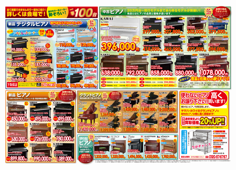 中古アップライトピアノは16.5万円から、中古グランドピアノは55万円から、新品電子ピアノは6万円から一挙100台展示!