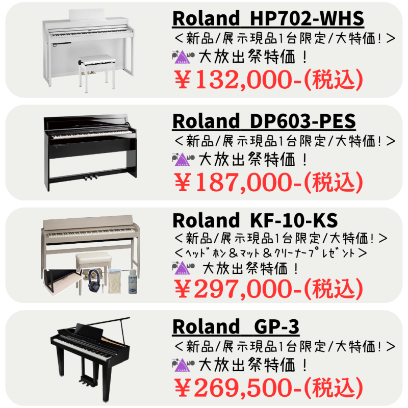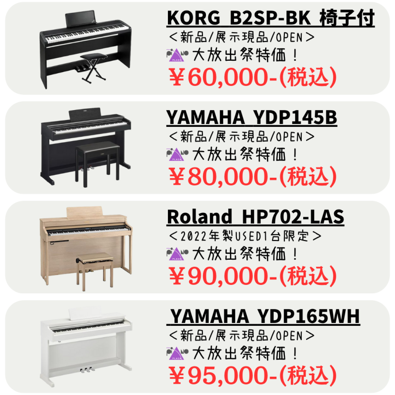 毎回大好評の日替わり特価品には、新品コルグ電子ピアノB2SP-BKが6万円(税込)、新品ローランド電子ピアノFP30X-BKが7.7万円(税込)、新品ヤマハ電子ピアノアリウスYDP-145Bが8万円(税込)、新品ヤマハ電子ピアノアリウスYDP-165WHが9.5万円(税込)、中古ローランド電子ピアノHP702-LAS【2022年製】が9万円(税込)、スタインバー中古ピアノYUG5【2000年製】が16.5万円(税込)、カワイ中古ピアノKL32BF【1981年製】が19.8万円(税込)、ヤマハ中古ピアノHQ90B【1995年製】が18万円(税込)など、ピアノプラザならではの衝撃特価でお買い得品を多数ご用意しております。