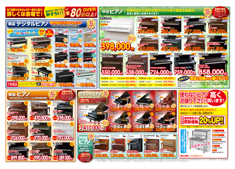 中古アップライトピアノは18万円から、新品電子ピアノは5万円から。 一挙80台展示! 選べる楽しさをぜひ会場でご体感ください。