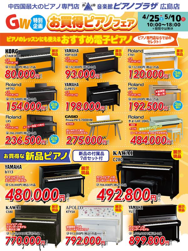 GW限定「お買得ピアノフェア」開催 4/25(土)〜5/10(日)|音楽館ピアノプラザ広島店